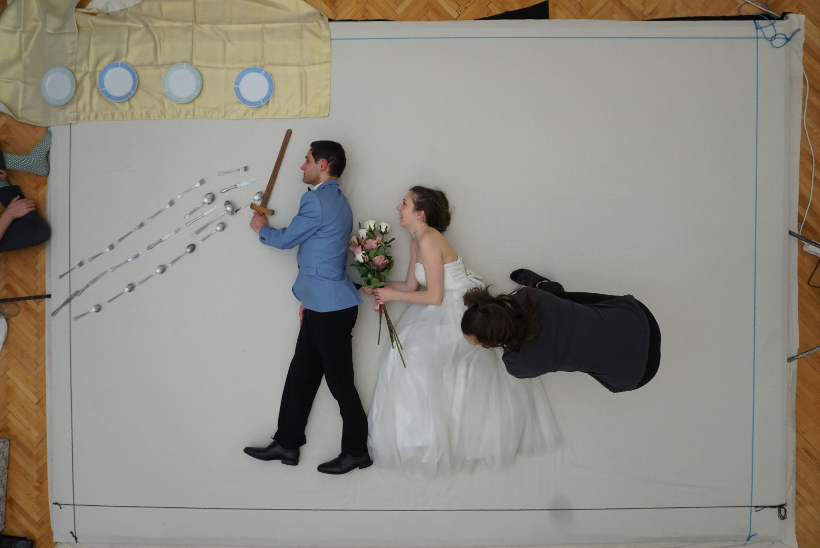 A menyasszony eltűnik, az örömapa nem találja a beszédét, a megjátszott probléma bármi lehet, ennek csak a képzelet szab határt. Az esemény főszereplőjét kamerával követjük. Egyik pillanatban még az élő kameraképet látja kivetítve mindenki, a következőben pedig már egy, az esküvő előtt forgatott kisfilmet. A vásznon látott jelenet akár akkor és ott is játszódhatna. Emiatt a nézők a teljesen abszurd történések láttán hamarabb gondolnak arra, hogy hatalmas probléma van, tönkrement az utolsó részletig megszervezett nap, mint arra, hogy megtévesztés áldozatául estek. Egy ilyen élmény garantáltan maradandó lesz mindenki számára, sokáig emlegetni fogják a meghívottak az esküvő után is.